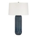 The Troy Lighting PTL4828-PBR Hopkins 28″ table lamp is a truly striking piece of lighting artistry, featuring masterfully applied indian cut glass techniques and a dramatic ombre effect. The cylindrical glass base has a fine, sophisticated textural quality, which is further accentuated by delicate, artistic etchings throughout the surface. The color is the most dramatic element, with a rich gray-blue hue that intensely deepens into a darker shade at the base, creating a moody, beautiful gradation. To ensure the focus remains on the beauty of the glass base, Hopkins is topped with a simple, contrasting white linen taper shade. Finished with warm patina brass details, the 28″ size is a sophisticated, artistic, and commanding accent light.